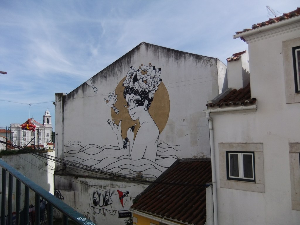 Street art around the city on the left. In the picture on the right is a views across the rooftops of Lisbon.